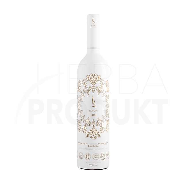 DuoLife Dzień: sok z owoców winogron, sok z owoców dzikiej róży, sok z owoców czarnego bzu, sok z owoców głogu, sok z owoców żurawiny wielkoowocowej, sok z owoców granatu, sok z owoców noni, sok z owoców rokitnika, sok z owoców malin, ekstrakt z owoców dzikiej róży, ekstrakt z jagody acai, ekstrakt z ziela lucerny 10:1 (45,8 mg/25 ml), ekstrakt z korzenia żeń-szenia (27,49 mg/25 ml, w tym 3,79% ginsenozydy – 1,04 mg/25 ml), ekstrakt z liści aloesu 200:1 (9,16 mg/25 ml, zawartość aloiny 1 ppm).